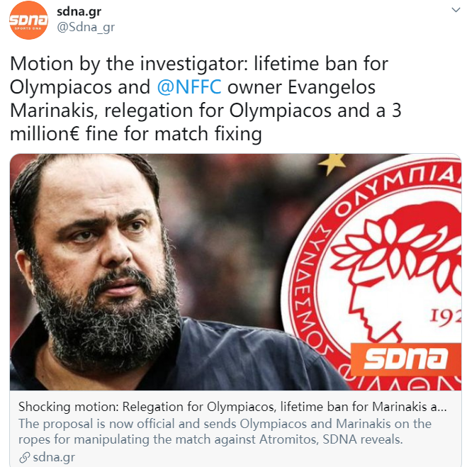 据希腊媒体SDNA消息,希腊豪门奥林匹亚科斯涉嫌在2015年踢假球,若情况属实,奥林匹亚科斯将面临降级的处罚,而球队老板马里纳基斯将遭到终身禁赛和近300万欧元的罚款的处罚。