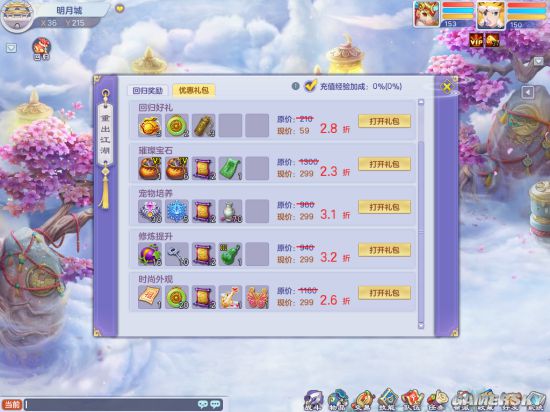游戏针对回归玩家设计了一大批福利,首先是回归礼包。作为回归玩家,可以以超低的价格购买到超值的道具礼包。礼包的内容丰富全面,有宝石、宠物和修炼道具等等,方便回归玩家追上当前的进度。礼包的折扣很高,基本上在2-3折左右,称得起是物美价廉。