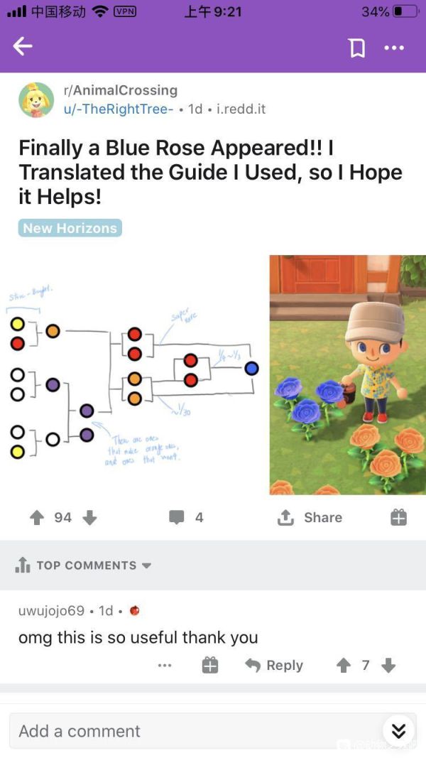 贴一下reddit上另一种方法的高清图,我直觉他的方法挺靠谱的,但是当时我嫌二代紫太麻烦而且我的二代红已经出了一大片了,就没去种。如果有人从零开始的不妨试试这个方法。新作的蓝玫瑰方法绝对不是唯一的,目前广为人知的和二代红杂交法概率极低,据说还有纯种橙直接出蓝的,但是我都没验证过。