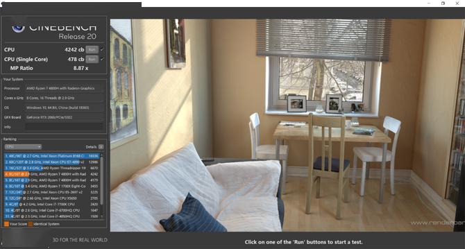 Cinebench R20使用比R15更大、更复杂的测试场景,需要大约8倍的渲染所需的计算能力,该测试还需要大约4倍的内存,并同时测试机器在高CPU负载下的稳定运行。最终的成绩,多核得分4242cb,单核得分478cb。