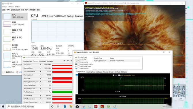 在测试上,使用AIDA64以及FurMark软件在增强模式下对该机进行了约20分钟的双烤测试。从测试的结果看,CPU温度基本维持在94℃,显卡则在77℃左右,就温度来说都没有达到最高峰值,频率方面依然有进一步提升的空间,我们没有进行绝对地压力测试,但这样的散热效果以及性能表现,完全能够满足游戏稳定运行了。