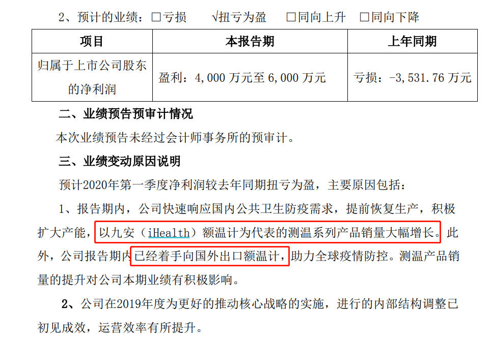 不只是做口罩的延江股份,生产测体温的额温计的股票九安医疗一季度也扭亏为盈。3月30日晚间九安医疗也发布一季度业绩预告,预计盈利4000万-6000万,而去年同期亏损3532万元。