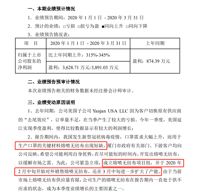 3月30日晚间,延江股份发布一季度业绩预告称,预计一季度净利润3628.71万元-3891.03万元,同比增长315%-345%。公司生产的用于口罩的关键材料熔喷无纺布在报告期内一直处于供不应求的状态,成为本季度业绩增长的主要因素之一。