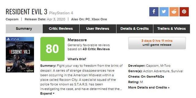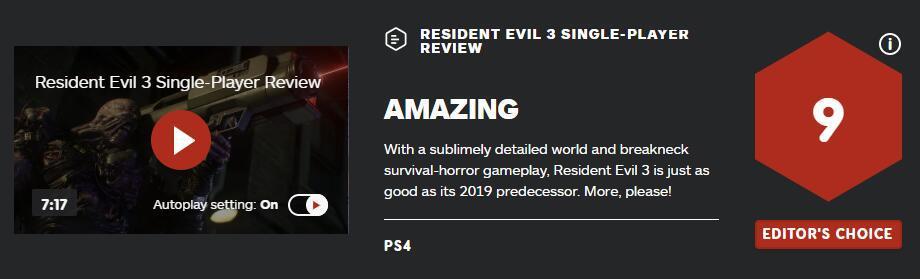 虽然玩家要等到4月3日才能玩到《生化危机3:重制版》,但不少媒体已经拿到了游戏并进行了测试和评分。其中IGN给出了9分的高分,并给予了编辑之选。但Gamespot只打了6分,另外metacritic汇总评分目前为80分(基于PS4版,目前评分媒体数量为43家)。