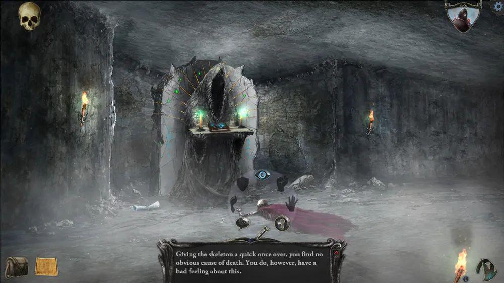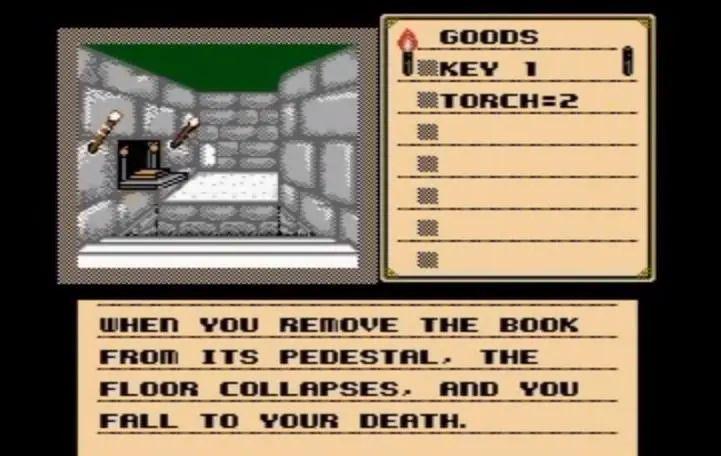 正如开头所说,作为一个点击解谜游戏,你需要探索 Shadowgate 的各个房间,然后与场景中的物品互动,得到新的道具或者查看文本提示。不过 Shadowgate 的一大特点就是极其容易 Game Over,城堡中处处都是陷阱,可能你在拿起架子上一本书时,地上就会出现一个大坑,主角摔下去当场死亡。为了避免这些陷阱,玩家唯一的办法只有试错,可以说这也是本作的核心玩点。好在各种死亡方式都比较另类,文字描述也不算枯燥。另外,火把在游戏中是最重要的道具,如果火把用完了,主角直接回因为看不清路摔断脖子而死,非常讲道理。所以游戏途中保证手头火把数量的充足十分重要。在一次次死亡后,玩家也会慢慢地接近终点,见到 The Warlock Lord,赢得最终的胜利。