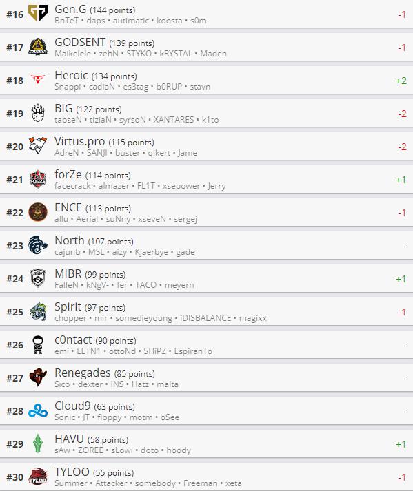 原标题:CSGO最新世界排名:TYLOO降至第30名