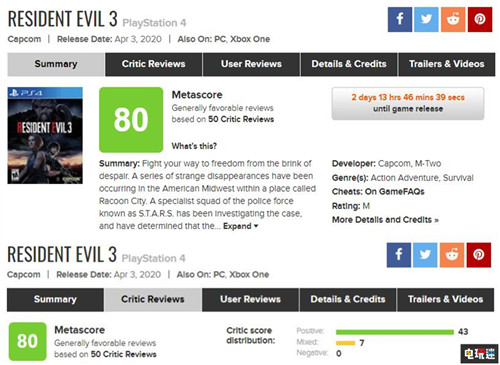 作为卡普空精致冷饭的“第二盘”,离发售还有两天的《生化危机3重制版》的全球媒体评分已经解禁。综合评分网站Metacritic目前综合评分达到80分,成为Metacritic截至目前2020年PS4游戏评分排行第13位。在目前收录的50个媒体评分中,共有43个好评和7个中评。