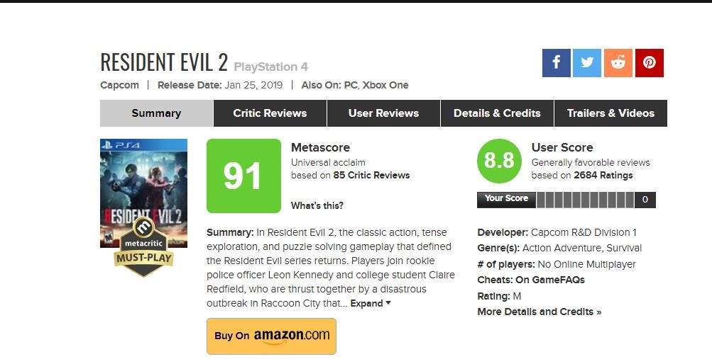 目前本作在综合评分网站Metacritic上的媒体平均分为80分,单从分数上来看,80分还算是一款可圈可点游戏的分数。然而在去年发售的《生化危机2:重制版》的MC媒体平均分可是高达了91分,这也意味着《生化危机3:重制版》下降了整整11分,这么一比较下来,本作的退步也就非常明显了。