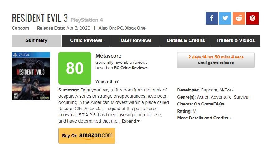 2020年的日历即将翻到4月,在4月上市的游戏阵容中,玩家排行在第一位的肯定是即将在4月3日发售的《生化危机3:重制版》。本作在半个月前便推出了一款试玩体验版,玩过体验版的玩家无不大喊“真相!”,对正式版也多了一分期待。如今正式版发售在即,游戏的全球媒体评分也已经解禁,不过从评分上来看,《生化危机3:重制版》相较前作似乎栽了跟头。