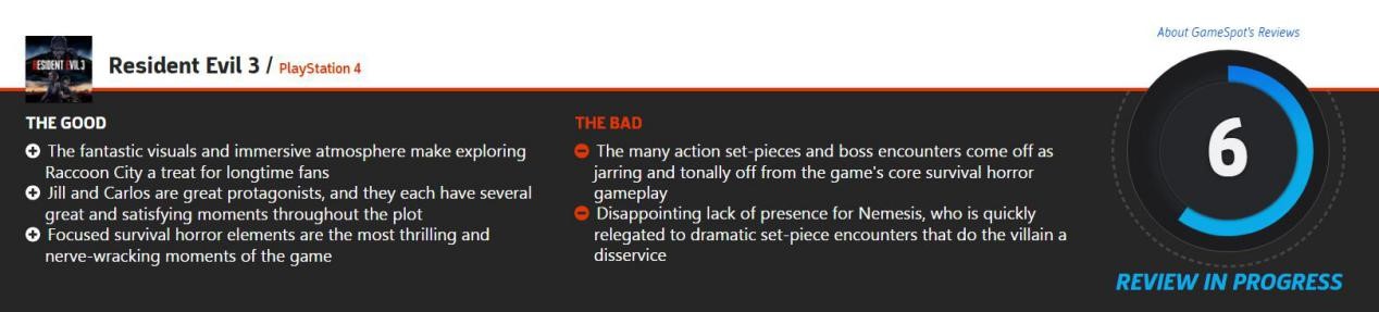 VG247总评认为,《生化危机3:重制版》虽然仍值得一玩,但它对于Capcom来说是去年完美重制的一个退步。虽然它看起来很漂亮,“突然惊吓”(Jump Scare)的部分也很到位,但就像是穿了一双舒适的鞋子,即时你的脚觉得很舒服,但永远不会觉得像在家一样。