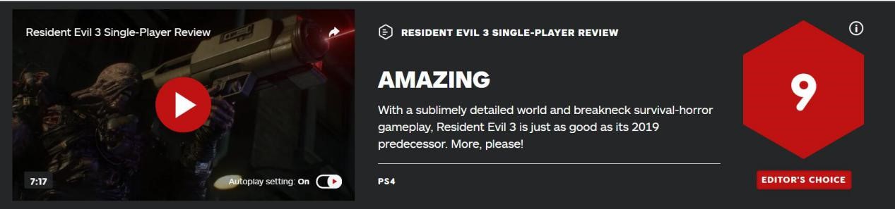 在抛开平均分专门看单家的媒体评分,也可以感受到《生化危机3:重制版》的口碑两极分化颇大。首先是老牌权威媒体IGN为本作给出了9分的高分,这无疑是一个称得上“准神作”的分数。