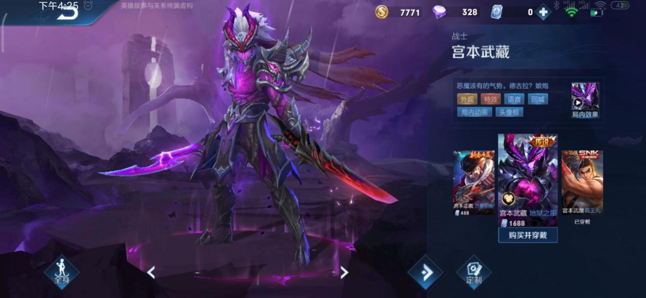 宫本武藏是王者中使用二刀流的战士,对于敌人有着极强的收割作用。作为宫本的传说皮肤,这款地狱之眼以紫色作为主要的配色,将地狱的诡异彰显得淋漓尽致。