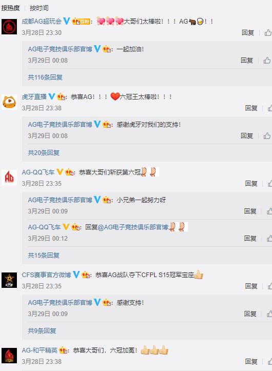 夺冠之后,AG其他分部和各个大佬官方都是送上了祝福,可以看到,对于AG的CF分部,AG超玩会都是称呼一声大哥哦,这是自然的,因为AG的CF分部才是AG俱乐部真正的最大牌面,荣誉太多了。