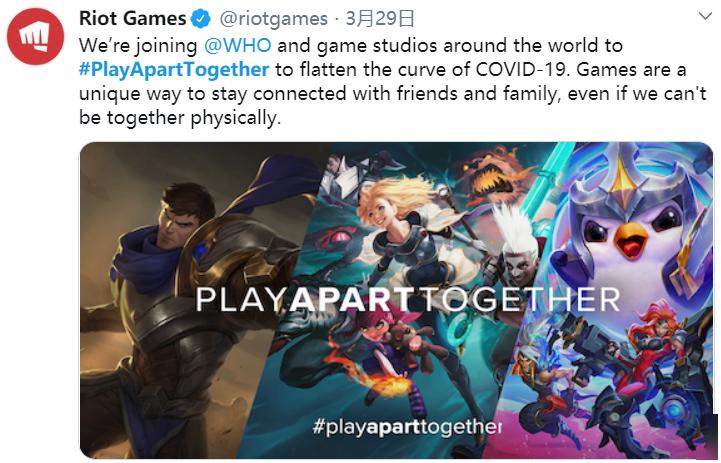 拳头:「我们联合WHO和其他游戏工作室发起#PlayApartTogether活动,以减少COVID-19的传播和扩散。当我们在现实世界中不能待在一起的时候,游戏能够将我们和家人、朋友连接在一起。」