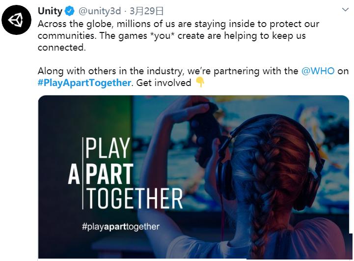 Unity:「在全世界范围内,成千上万的人正独自待在家里,以保护我们的社区。『你们』创造的游戏,正在帮助我们连接在一起。」
