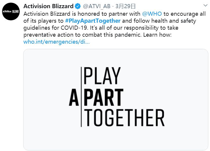动视暴雪:「非常荣幸能和WHO合作,共同鼓励玩家在参与#PlayApartTogether活动的同时,遵守防治COVID-19的健康安全指引。采取预防措施来抵御这种大流行病,是我们共同的责任。」