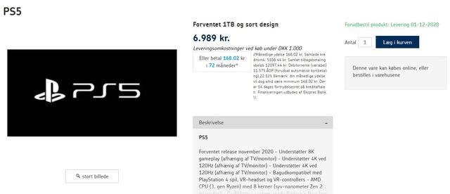 据这家叫做Foetex的丹麦零售商显示,1TB版本的PS5售价6989丹麦克朗(约合1043美元/人民币7330元),同时网站显示PS5将于2020年12月1日发售。但是这个日期虽然符合之前索尼官方公布的2020年年底的范围,可应该只是一个占位符。