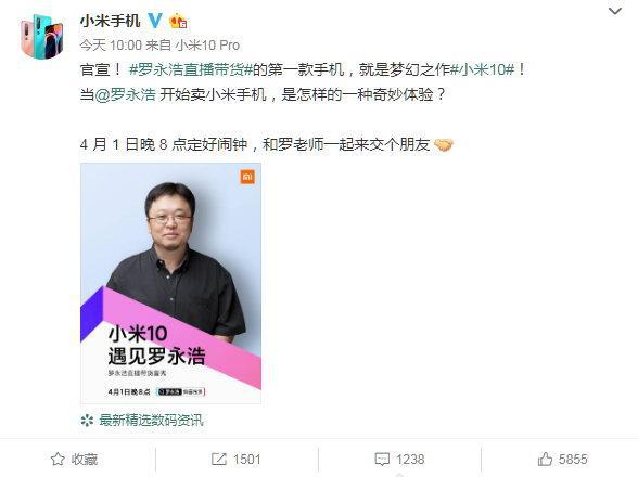 4月1日晚20点罗永浩将在抖音带来他的带货首秀。一时间,关于首秀选品的猜测纷至沓来。今天上午,小米率先揭晓悬念,官宣罗老师直播带货的第一款手机就是小米10。官微也调皮地表示“当罗永浩开始卖小米手机,是怎样的一种奇妙体验?”。