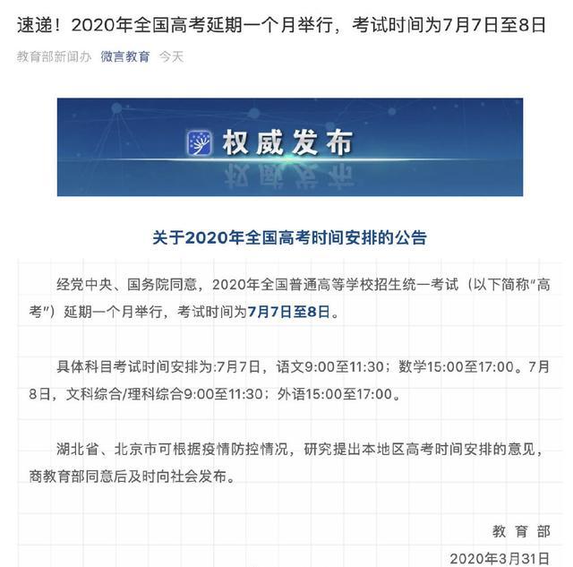 来自教育部新闻办今日发布的最新公告,2020年全国普通高等学校招生统一考试(简称“高考”)延期一个月举行,考试时间改为7月7日至8日。
