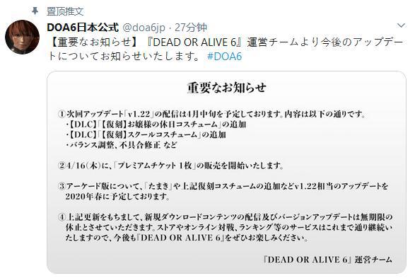 光荣特库摩官方在推特上宣布:PS4、Xbox One以及PC版本的《死或生6》即将无限期停止后续DLC内容和版本更新,不过,之后依旧会为玩家提供线上对战内容。
