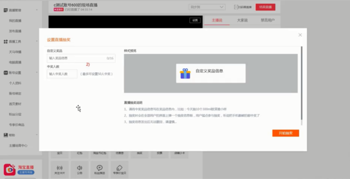 主播在淘宝直播的过程中可以跟买家进行一个抽奖的活动来引起他们的兴趣,避免他们在观看之后进行大幅流失,我们点开抽奖之后需要设置自定义奖品,奖品建议实物,中奖人数也是可以自己设置,可以根据店铺观看人数和盈利情况进行设置,因为这里是免费赠送的,所以我们需要计算成本。