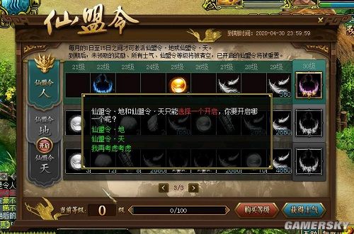 奖励栏分为“天”“地”“人”三类。其中“人”为领取免费,“地”或“天”则需要各位道友花费6800或16800金元宝激活。其中,“地”“天”只能选择一个进行激活,若玩家先开启的“地”后若想再开启“天”,可以花费两个仙盟令之间的差额来进行切换,但已经领取过的等级奖励无法再次领取。