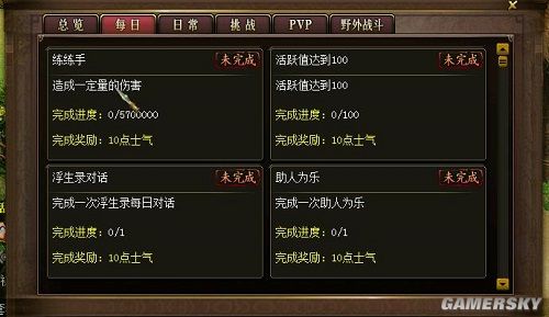 在每日的“成就总览”中,公测区的任务主要分为日常、挑战、PVP、每日、野外战斗这几种获取方式,经典区主要分为日常、挑战、PVP、每日这几种获取方式。所有玩家每天看到的成就类型,除了前四个为每日固定成就外,其余六个成就将随机分配。但是梦回殷商和八仙梦境在一个自然日内不会同时出现,昆仑神镜和副本任务在一个自然日内不会同时出现。