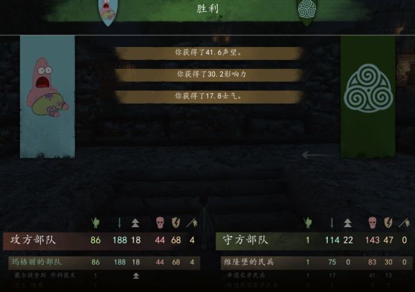 截图了一张站位示意图和结算图。因为杀敌主要靠主角,这个套路不吃部队的练度,我的兵都是杂七杂八的贼徒,弓手全清一色森林强盗线的低级兵,最后200vs190打出来的战损比也不错。看我升级数据还能发现,这个套路也非常地适合练双手和跑动,打不下城撤退也是很赚的鸭