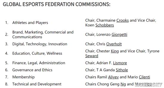 4、教育、文化与慈善委员会 ( Education, Culture, Wellness Commission )核心职能:代表协会执行教育,文化和健康领域的工作,开发和认证教育体系和职业规范,鼓励与相关组织合作。主席 Chester KING (英国电子竞技协会首席执行官)副主席 Tyrone SEWARD (斯科蒂考文垂学院联合创始人)