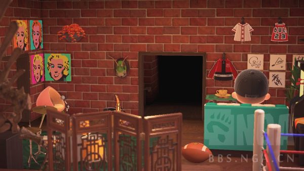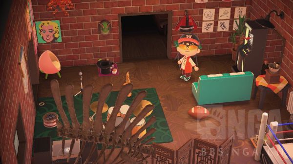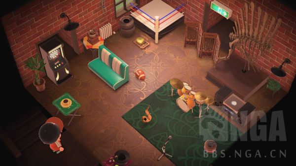 club大概分4个区域:左下是休闲区,有咖啡,有飞镖,大家聊天用的;右下是音乐区,这里给大家做乐器房间一个小tips,就是一定放个音箱,把cd当伴奏,你会发现自己一个人玩乐器的也会很有意思;左上是拳击格斗区,毕竟猛男之森;右上背景区,装饰了恐龙化石,和工业风简直太搭了。