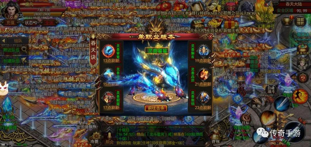 【六大灵兽】BOSS会定时出现在灵兽驻地,灵兽BOSS掉落无归属,大家都能拾取!爆率非常高,满屏光柱。