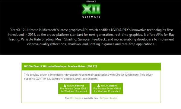 可以说,DX12终极版里有着NVIDIA莫大的贡献,很大程度上就是汲取了其Turing图灵架构设计的精髓,NVIDIA支持起来自然也会更轻松,今天就 面向开发者,发布了DX12终极版的首个开发者预览版驱动, 版本号450.82。
