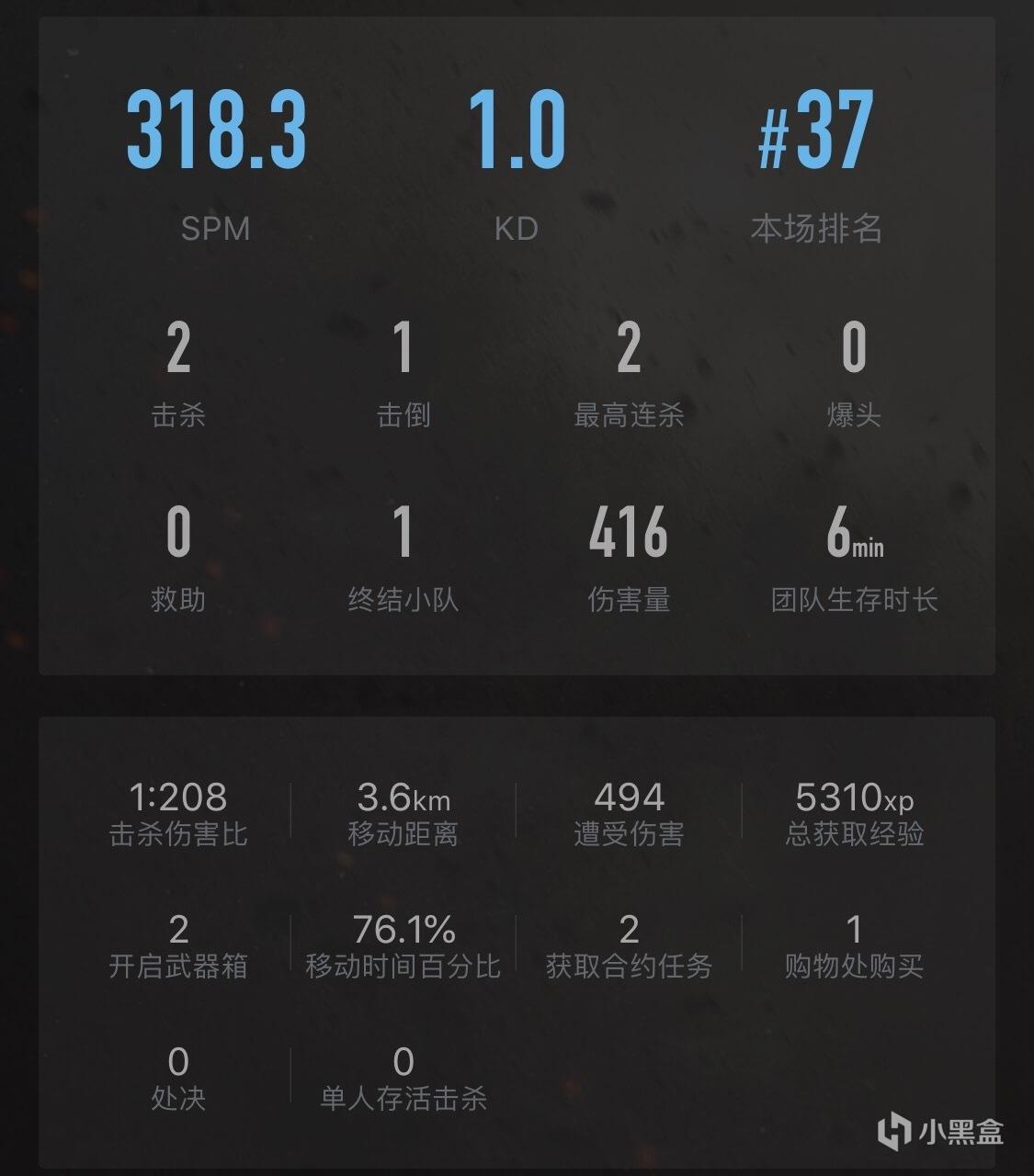 在这一局中,我们可以看到,虽然生存时间很短,仅有6min,但是SPM得分却不低,因为击杀以及任务,得分方面获得了较好的体现,这就是方案二:高得分+低生存时间=高SPM=高排名(PS.KD还是正的)
