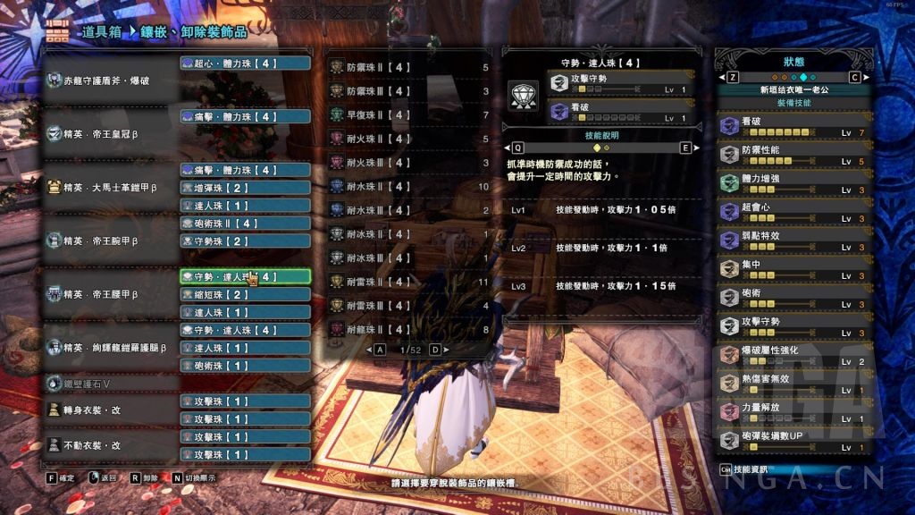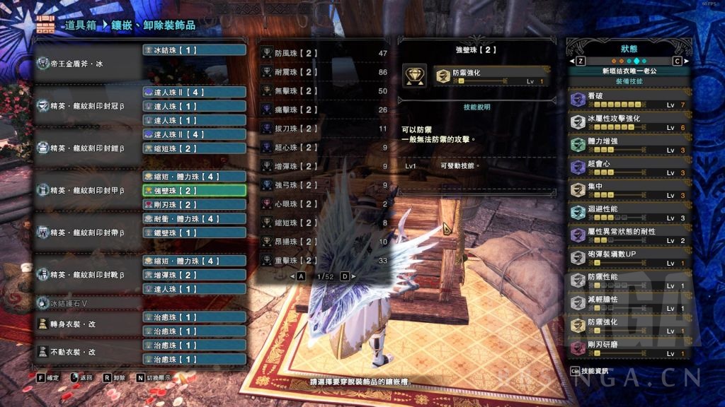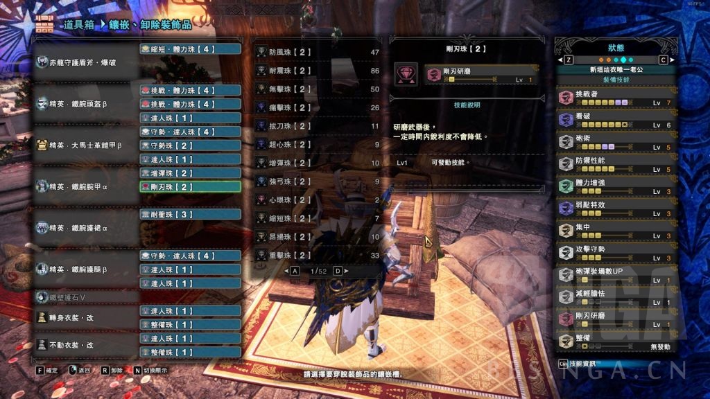 本配装特色:拔刀80会,穿衣装95会;刚刃配磨刀鱼保斩味;耐属3避免解一串0的尴尬;耳塞3防所有吼;不需要防性就可以红盾GP除牙通牙大招和背砸尾砸外所有招式不大退