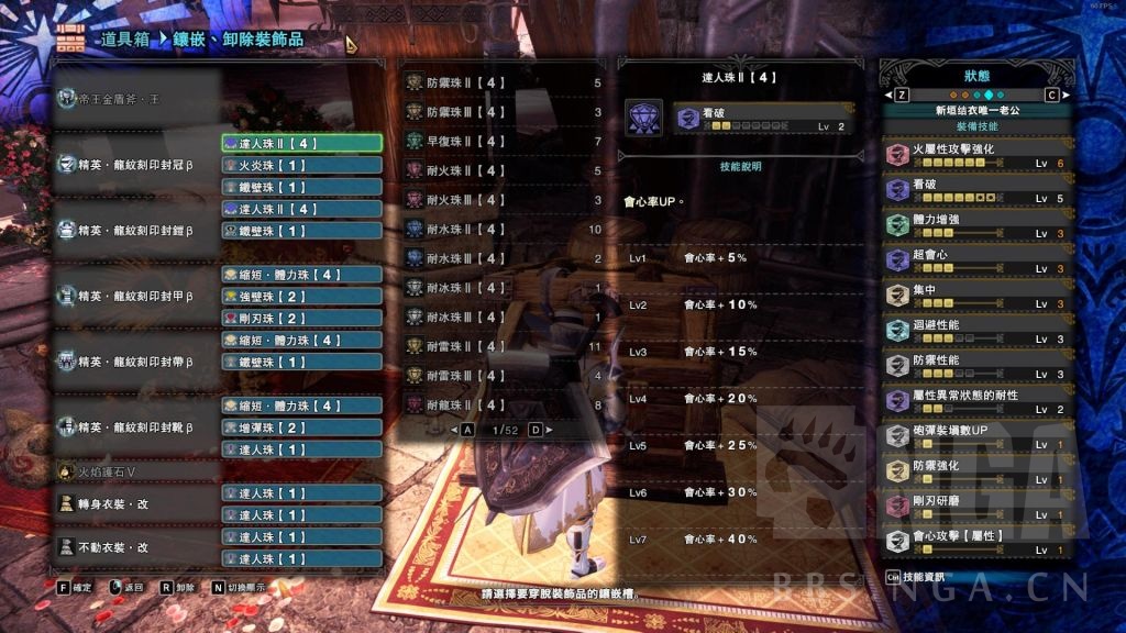 适合属性超解的怪物还是比较多的,总体思路是看破+赤龙5堆会心,保证属强6集中3体3增弹,针对不同怪物选择防性防强,珠子不齐优先下看破。