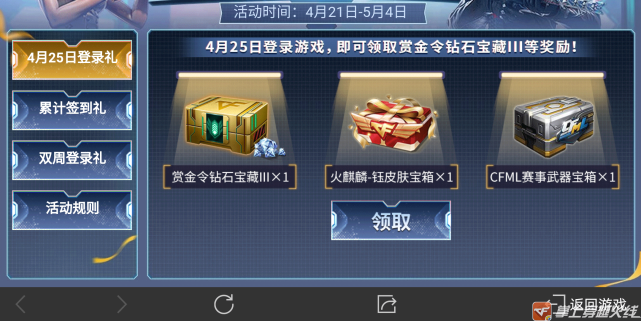 除了累计签到礼,在4月25日登陆游戏(即本周六),能够直接领取3个不同的宝箱。它们分别能够开出数量不等的钻石、火麒麟-钰皮肤和cfml赛事限定的专属武器,登陆一天,奖励三倍,小伙伴们是不是可以考虑定个闹钟提醒自己领取呢。