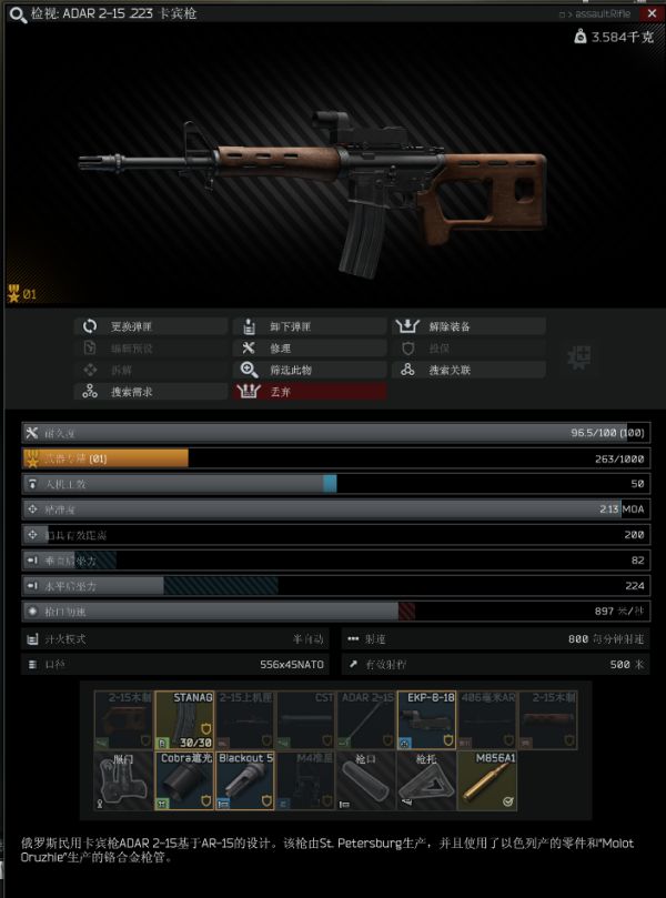 推荐新手ADAR 2-15新手单点神器(无全自动),可以谋害大佬哦。下面图片改装,只需把照门拿掉加个镜子就好,成本2W1千卢布(拿充电电池1W2千去换外加9千卢布买镜子),照门影响镜子效果所以我去掉了。谋害大佬请带M995子弹不过太贵了30弹夹一梭子弹300美元(商人价格300美元,玩家现在价格6W卢布),推荐萌新M855A1便宜很多一梭30颗子弹只需要1W卢布(这个是商人价格,玩家价格2W7000卢布),新手谋害大佬神器,便宜。