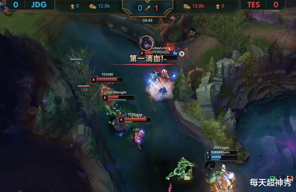 果不其然!进入召唤师峡谷后,TES战队率先发威,中下两路凭借对线优势全部取得线权,找到JDG回家的空隙,TES果断Rush峡谷先锋,不只成功拿下先锋,还帮助Jackeylove厄斐琉斯拿下一血,此时游戏仅仅尚未进行到9分钟,TES已经手握优势,逐渐掌控节奏。
