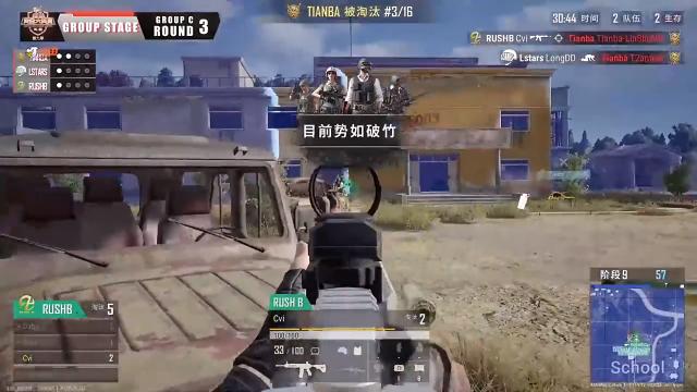 在C组R3中,仅剩一人的RuShB在天命圈中并不占优,前有满编战队的Lstars,后有三人队的Tianba,RuShB的Cvi只能靠偷袭来试图逆转局势。当Tianba与Lstars对线时,Cvi躲在汽车后面坐山观虎斗。最终Lstars战队的longDD凭借风骚的走位,与精准的预判团灭Tianba战队后,却被Cvi的终结,完成了本局比赛。