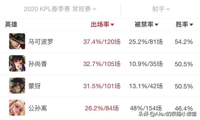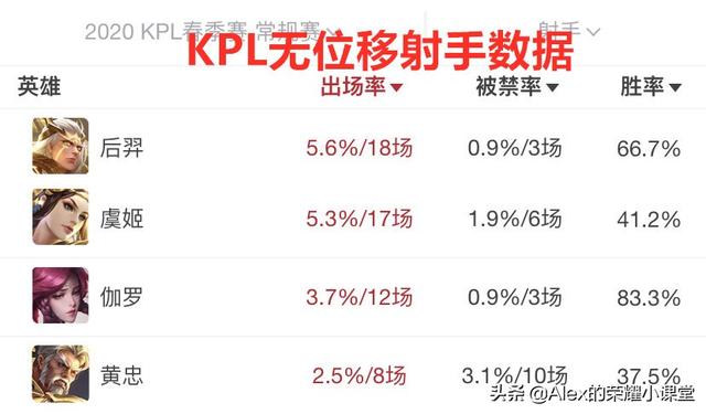 在2020年KPL春季赛上,后羿、虞姬、伽罗和黄忠分别登场了18、17、12和8次,而且后羿的胜率达到了66.7%、伽罗胜率高达83.3%。