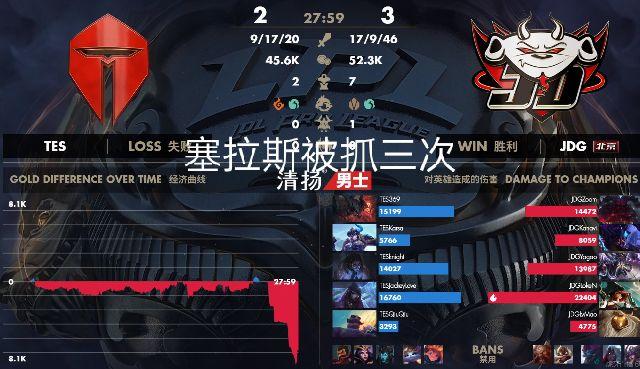 不得不说JDG的这个BP做的确实是挺好的,中单卡萨丁配合上单奥恩,然而TES却直接用一把中上换线战术破解了JDG的BP,左手的中单塞拉斯转去上路,而369的上单剑魔则去中路,这样一来JDG的优势就基本上没有了。然而让人没想到的是,左手虽然说中单很强,但是上单确实是比较菜。