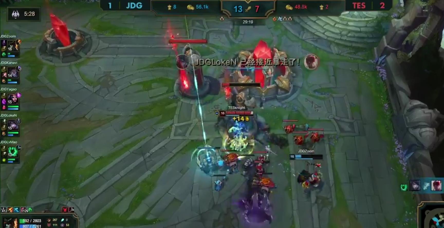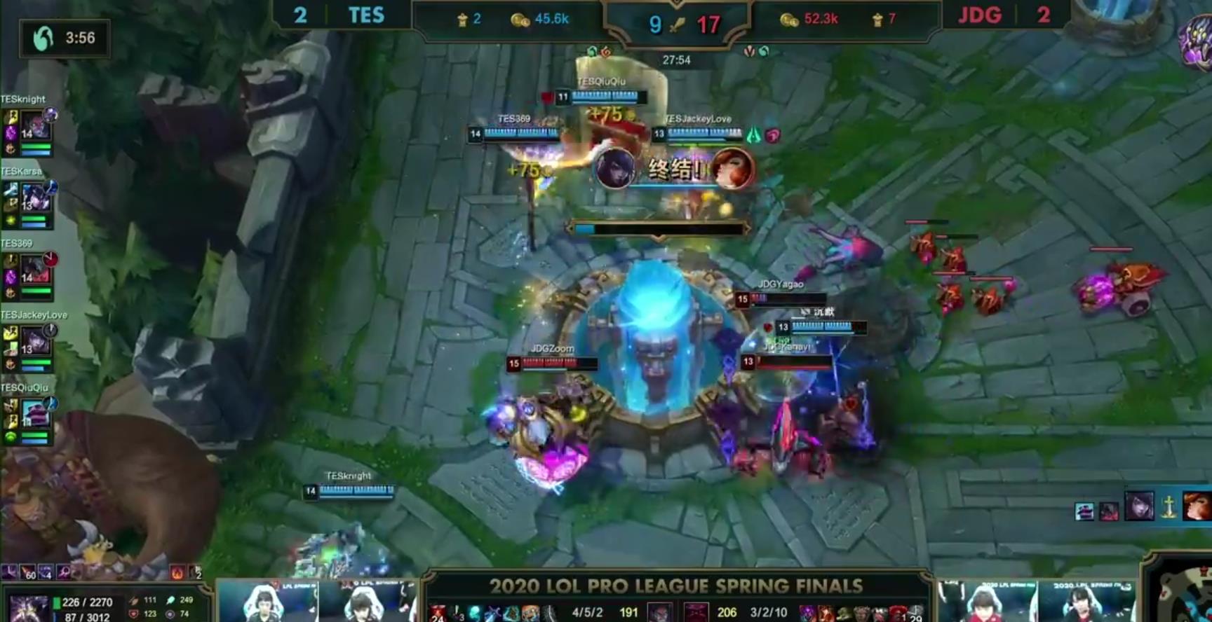 第三局比赛,TES延续上一把的状态,虽然前期经济劣势,但是后期knight和jackeylove在比赛中打出Carry的表现,二打五直接团灭JDG,最终TES完成翻盘拿到赛点,第四局比赛,JDG战队凭借zoom和Loken的完美发挥,成功将比赛拖进决赛局。
