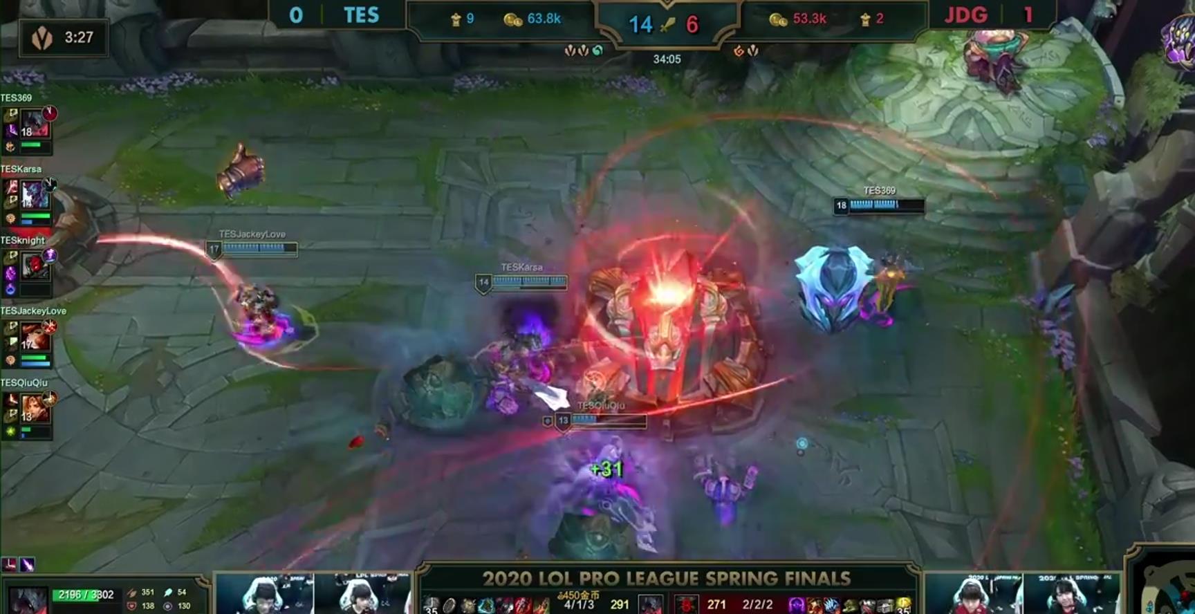 在第一局比赛中,TES战队拿下前期经济的优势,然而,JDG战队凭借Zoom奥恩的完美开团,成功完成翻盘赢下首局比赛,第二局比赛,TES依靠上中野的完美发挥,再次拿到前期优势,之后,滚起经济的雪球,最终,凭借巨大的经济优势,成功扳回一城。