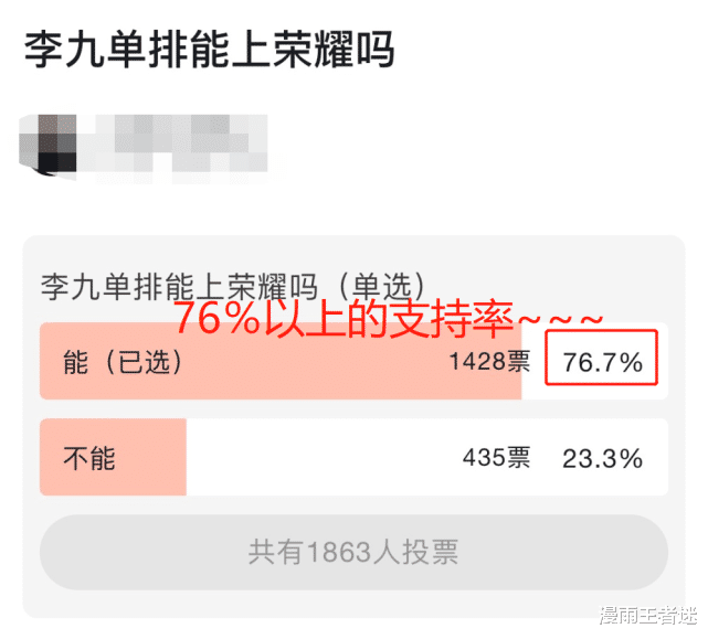 截止目前呢,大概有两千位网友参与了这一次投票。而投票结果显示,有超过76%的网友认为KPL解说李九能够打上荣耀。那么李九到底有没有单排荣耀的实力呢?其实李九他也看到了这个帖子,而且还在解说席上说到了这一件事情。李九是这么说的,我看到这个投票帖子,我选择了“能”,发现有很多小伙伴们都支持、相信我!
