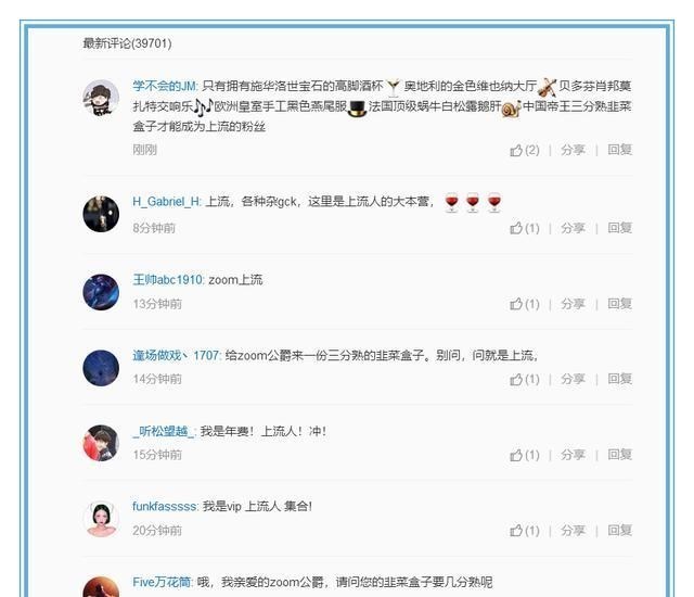 在JDG拿下春季赛冠军,lvmao现场唱王妃之后,王妃这首歌也彻底被网友们带火了,在王妃这首歌的评论区,全部都是网友们刷的上流评论,还有的网友问zoom公爵的韭菜盒子要几成熟,也有网友为zoom这位上流上单专门改编了歌词,成百上千页评论区都是关于上流的评论,可以说这首歌彻底沦陷了
