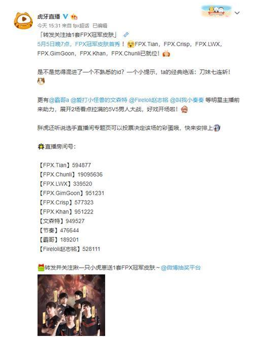 自从FPX在s9全球总决赛夺冠之后,战队名声大噪,在4月30日FPX的冠军皮肤也终于上线,而为了给FPX的冠军皮肤造势,和FPX签约的虎牙直播平台也不遗余力的支持,在4月30日—5月10日期间开启了FPX冠军皮肤狂欢周,只要观看直播就有几率免费获得FPX的全套冠军皮肤。