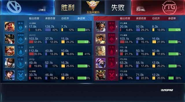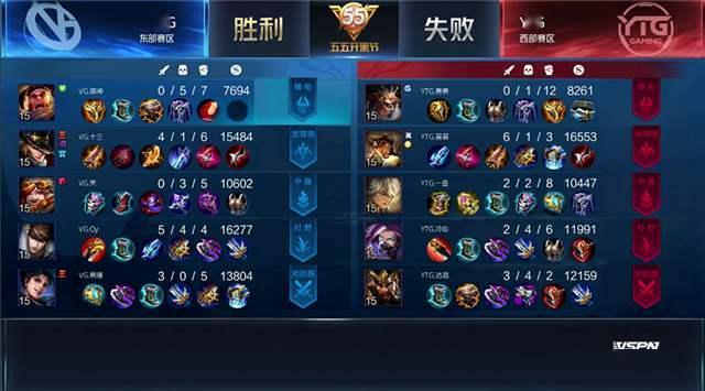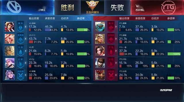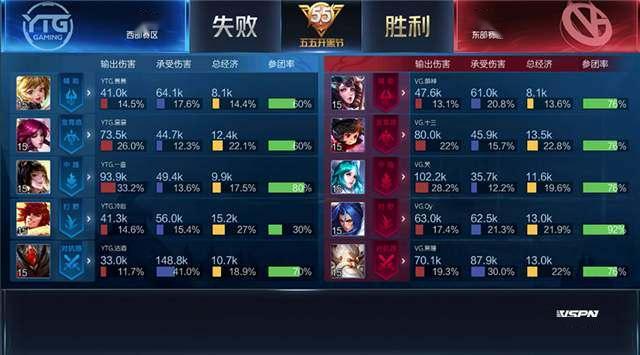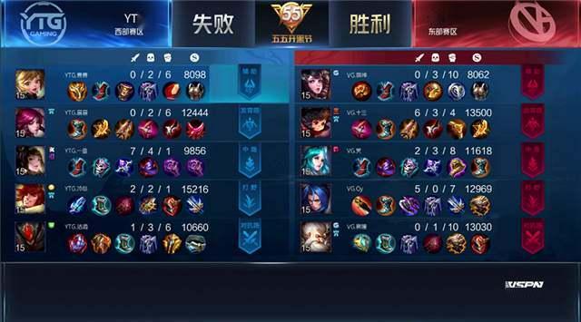 开局双方和平发育。2分28秒,YTG兰陵王惩击抢下第一条暴君。YTG张良击杀VG赵云,拿下一血。3分50秒,YTG兰陵王中路抓死VG赵云,下路再帮助队友击杀苏烈。5分40秒,YTG兰陵王再次惩击抢到暴君。8分20秒,VG击杀先知主宰。12分,YTG拿到黑暗暴君。14分25秒,双方河道开团,打出3换3,VG曜三连决胜。15分50秒,VG击杀黑暗暴君,团战打出1换1。17分40秒,VG抓死关羽后推掉下路高地,团战2换2。18分35秒,YTG击杀主宰,团战打出0换2。21分10秒,VG团灭YTG,VG马可波罗三连决胜,强推水晶一波赢下比赛。