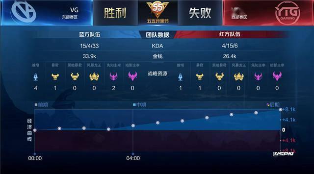 云中君开局抓上,0分33秒,VG云中君击杀YTG廉颇拿下一血。0分40秒,VG张良抓下,VG公孙离下路击杀VG后羿。2分40秒,YTG赵云击杀第一条暴君。3分30秒,VG中路团战打出0换4。5分30秒,VG公孙离配合张飞再次击杀YTG后羿。8分15秒,YTG盾山上路开团打出1换1。9分23秒,VG击杀先知主宰。10分24秒,VG上路发起进攻,团灭YTG,一波赢下比赛。