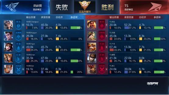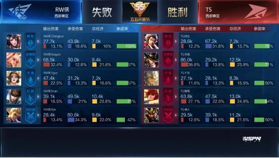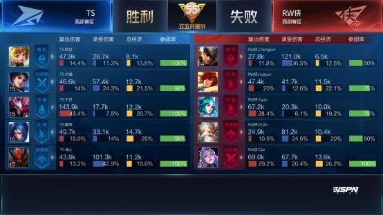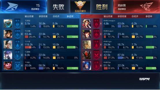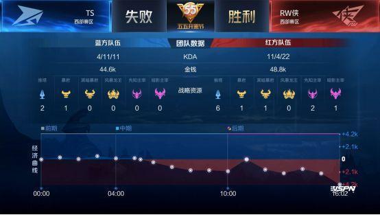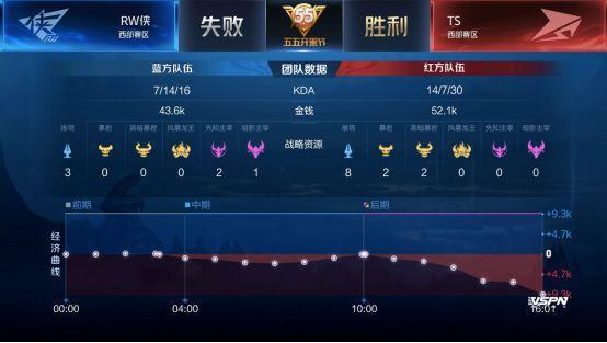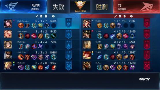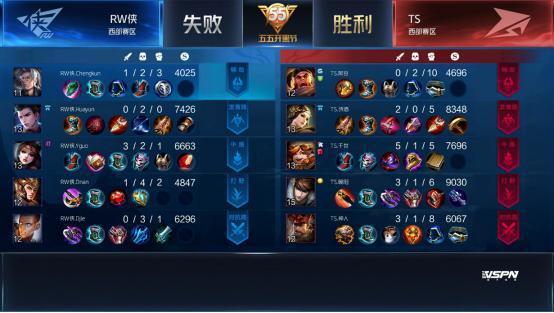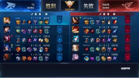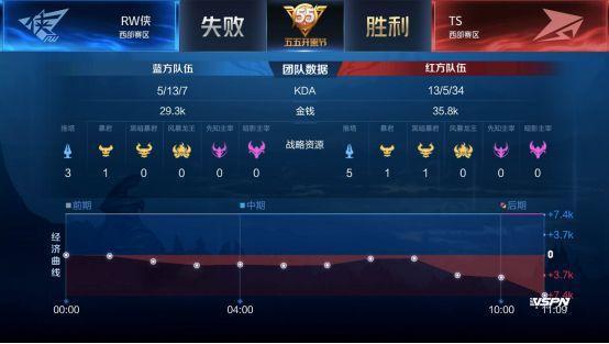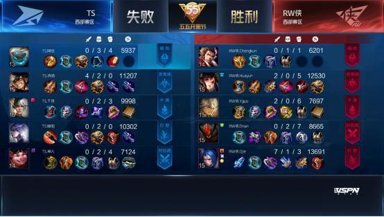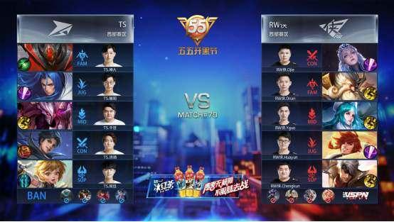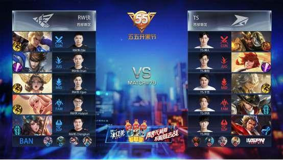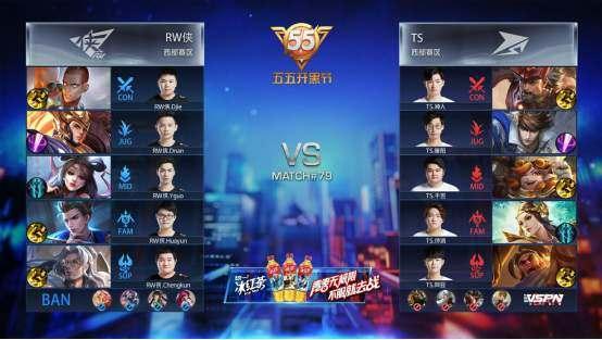 双方平稳开局,1分39秒RW侠下路击杀蒙犽拿到一血。2分40秒TS拿到暴君,团战RW侠击杀盾山。3分50秒RW侠野区击杀镜。4分37秒RW侠拿下先知主宰。5分15秒RW侠上路击杀猪八戒。6分整RW侠中路击杀盾山。9分59秒中路团战TS打出1换2,蒙犽拿到二连击破。13分15秒RW侠拿到主宰。15分01秒中路团战TS击杀张飞。15分29秒中路团战RW侠团灭TS,橘右京拿到四连超凡。16分01秒RW侠摧毁水晶拿下比赛。