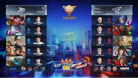 双方平稳开局,2分15秒RW侠中路击杀孙膑拿到一血。3分07秒TS拿下第一条暴君。4分19秒RW侠拿下先知主宰。6分16秒TS上路击杀夏侯惇、RW侠下路击杀曜。7分54秒RW侠拿下暴君。9分09秒RW侠拿下先知主宰。10分19秒中路团战TS打出0换3,橘右京拿到二连击破。10分48秒TS拿下黑暗暴君。12分15秒野区团战TS击杀老夫子。13分42秒TS野区击杀露娜。15分02秒野区团战双方1换1。15分39秒TS拿下黑暗暴君。16分32秒TS拿下主宰。17分59秒下路团战TS打出1换3。18分49秒TS强点水晶拿下比赛。